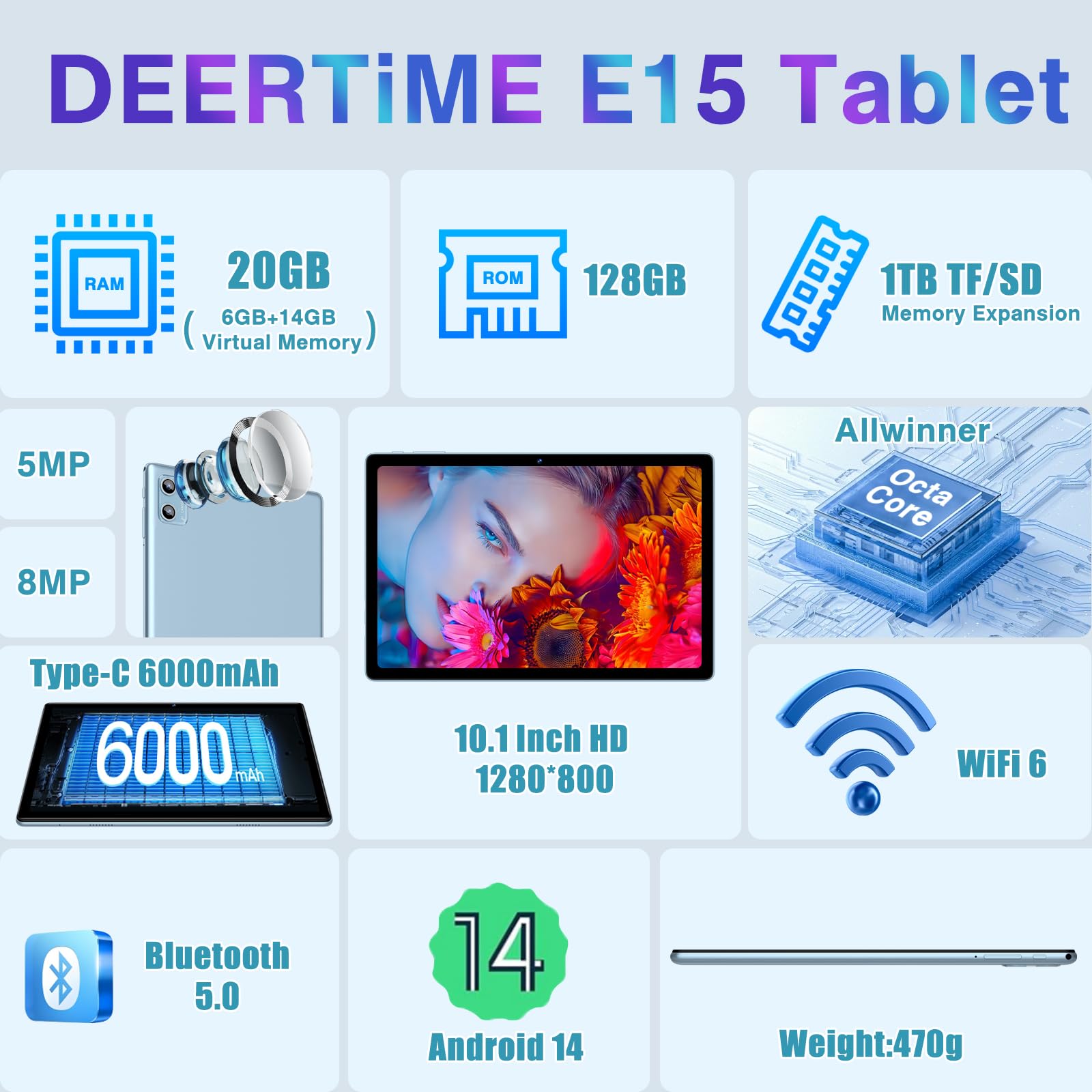- 🎫🎫【20(6+14)GB RAM+128 GB ROM+1 TB Expansion】🔥🔥E15 tablet features a Octa-Core chip coupled with 20GB RAM(6GB+14GB achieved through expansion technology) and 128GB ROM. Runs smoother and faster. It can also be expanded with a microSD card/TF card to add up to 1TB of additional storage(SD Card Not Included), whether you are using the tablet for work or study, switching between different applications is super easy.