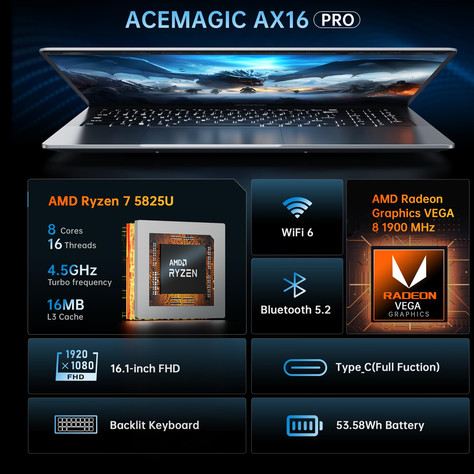 - 【TOP PERFORMANCE】: ACEMAGIC AX16PRO Laptop is equipped with the latest generation of high-performance AMD Ryzen 7 5825U processor (8C16T, up to 4.5GHz), which provides powerful computing power and graphics processing to ensure that the gamer can run all kinds of large 3D games smoothly.