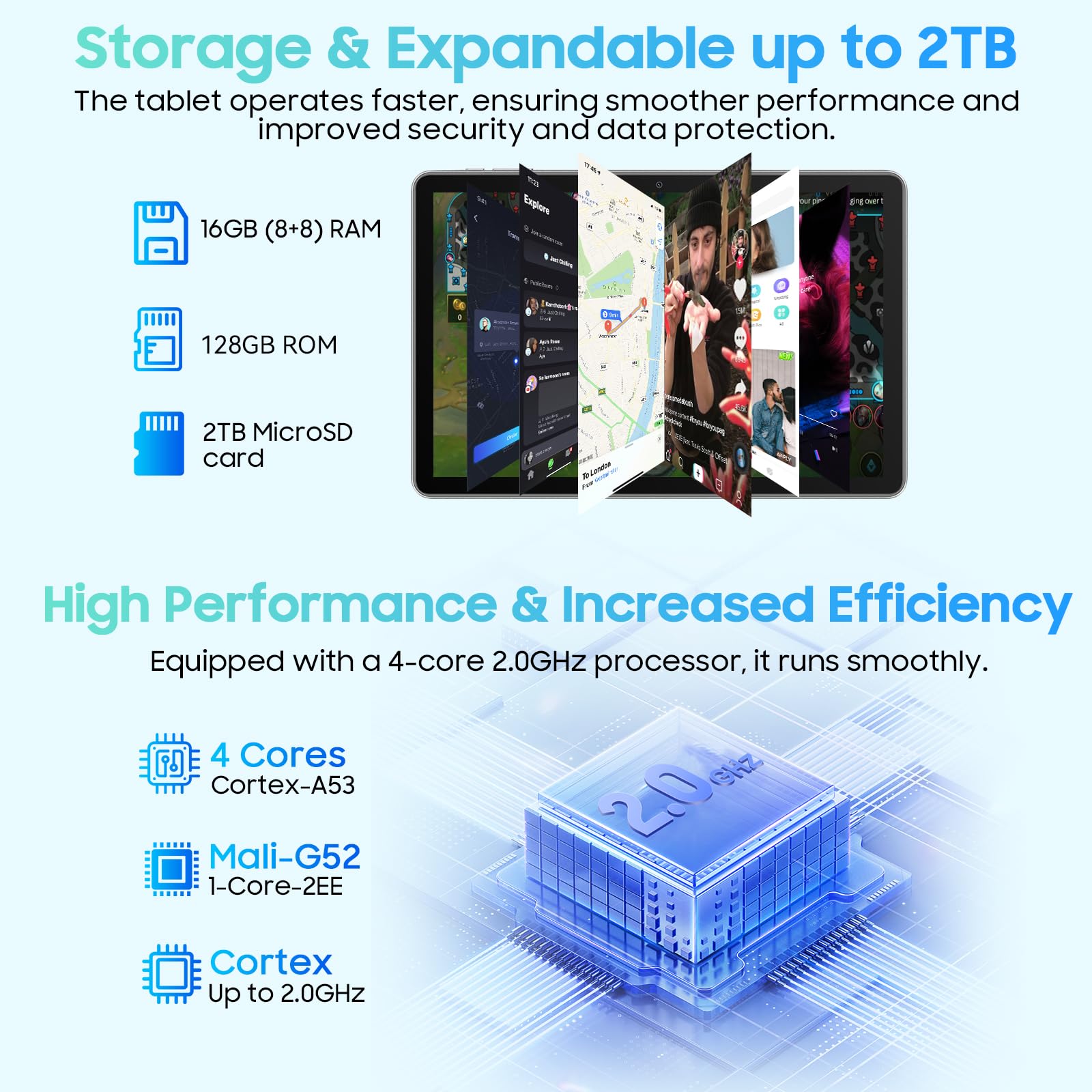 - [16GB+128GB/2TB Memory] Android 13 tablet with a 16GB RAM (8GB expandable in settings) and 128GB ROM, tablet offers unmatched performance and storage capacity. Tab70WiFi supports up to 2TB with a TF card. With a robust chipset and 16GB RAM, tablet handles multiple applications simultaneously, ensuring a lag-free experience. Say goodbye to sluggish performance and hello to limitless possibilities. Tablets have passed the Google GMS certification. You can download the software on Google Play.