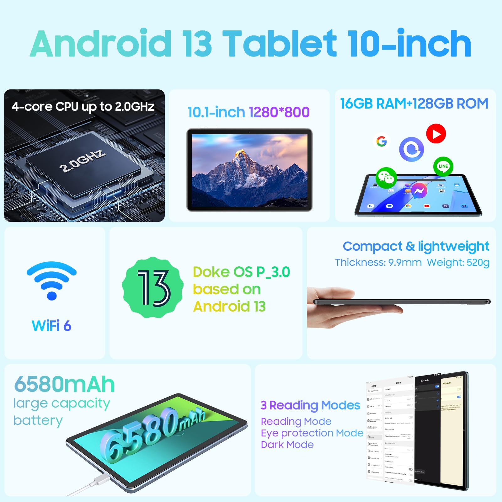 - [Android 13 Tablet] Blackview 10 inch tablet Tab70WiFi remarkable tablet combines the latest Android 13 system with an exclusive upgrade: the Blackview Doke_P 3.0 system. We enhance the foundation of Android 13 to ensure privacy and improve data security so you can experience the best of both worlds. Our seamless integration empowers the Tab70WiFi to operate with unparalleled smoothness, while offering enhanced convenience, speed, and a lot of personalized settings.