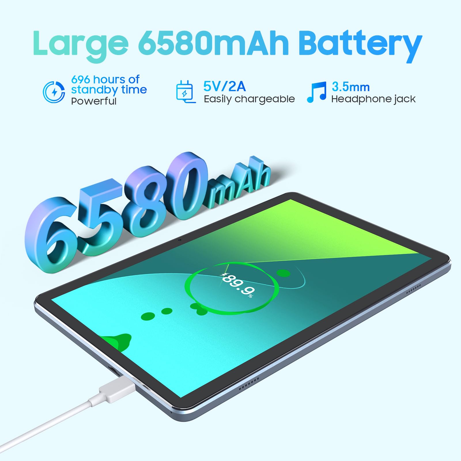 - [WiFi 6 and 6580mAh ] 10 inch tablet android Blackview Tab70WIFI adopts the latest WIFI6 technology. Compared with 5G WiFi, WiFi6 has been certified to be faster, larger in capacity, safer and more power-saving. Tablets 10 inch android with 6580mAh large battery can easily work or play for a whole day! It can stand by for more than 300 hours. The tablet package comes with a 10W UK 3-pin fast charging charger. Even if the battery is about to run out, you can quickly recharge it.