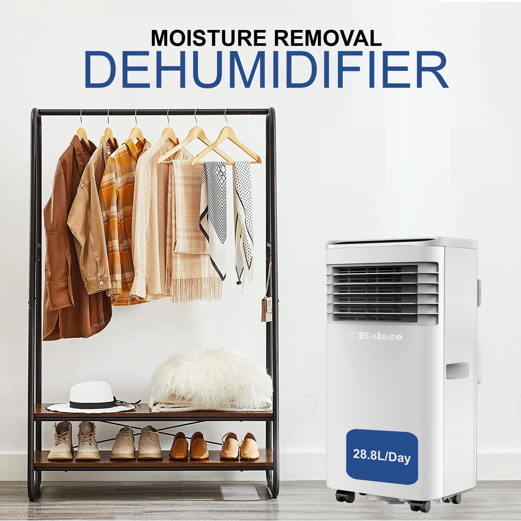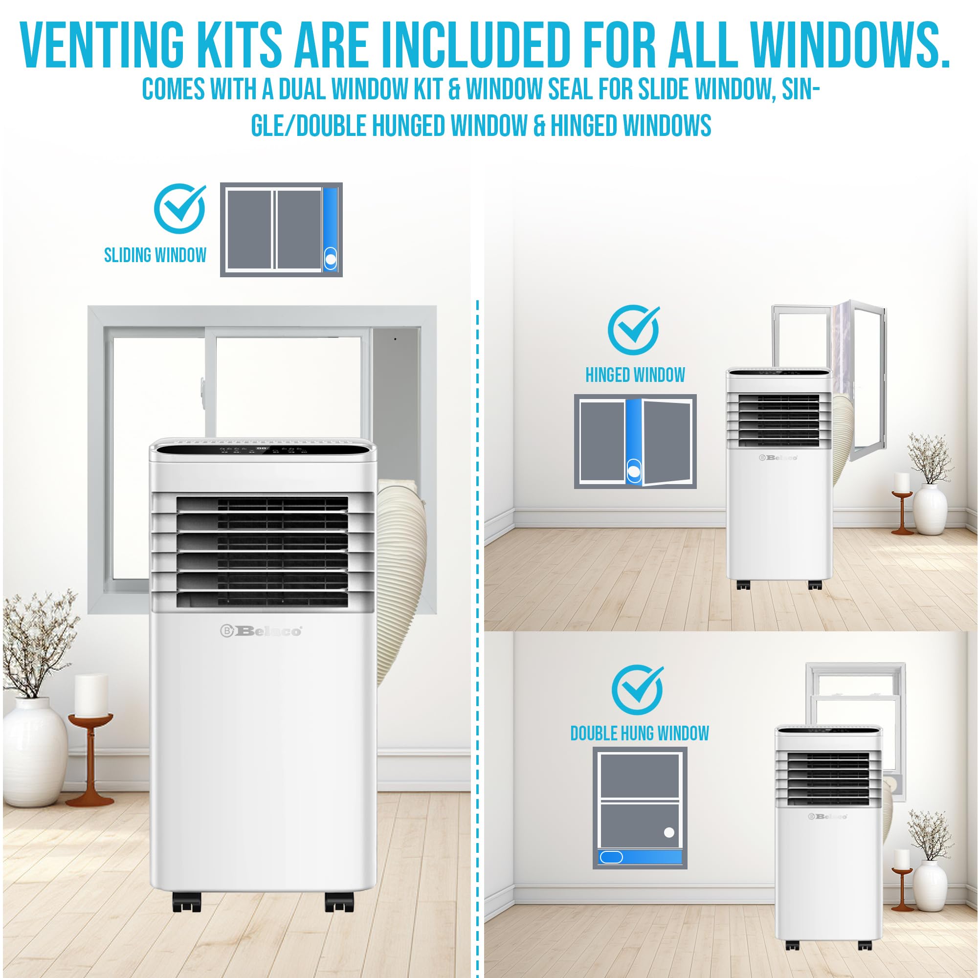Belaco Portable Air Conditioner, 9000 BTU 4-in-1, Air Conditioning Unit, Fan & Cooling, Dehumidifier, Remote control with 24Hr Timer, Dual Window kit Included with Class A Energy Efficiency Rating