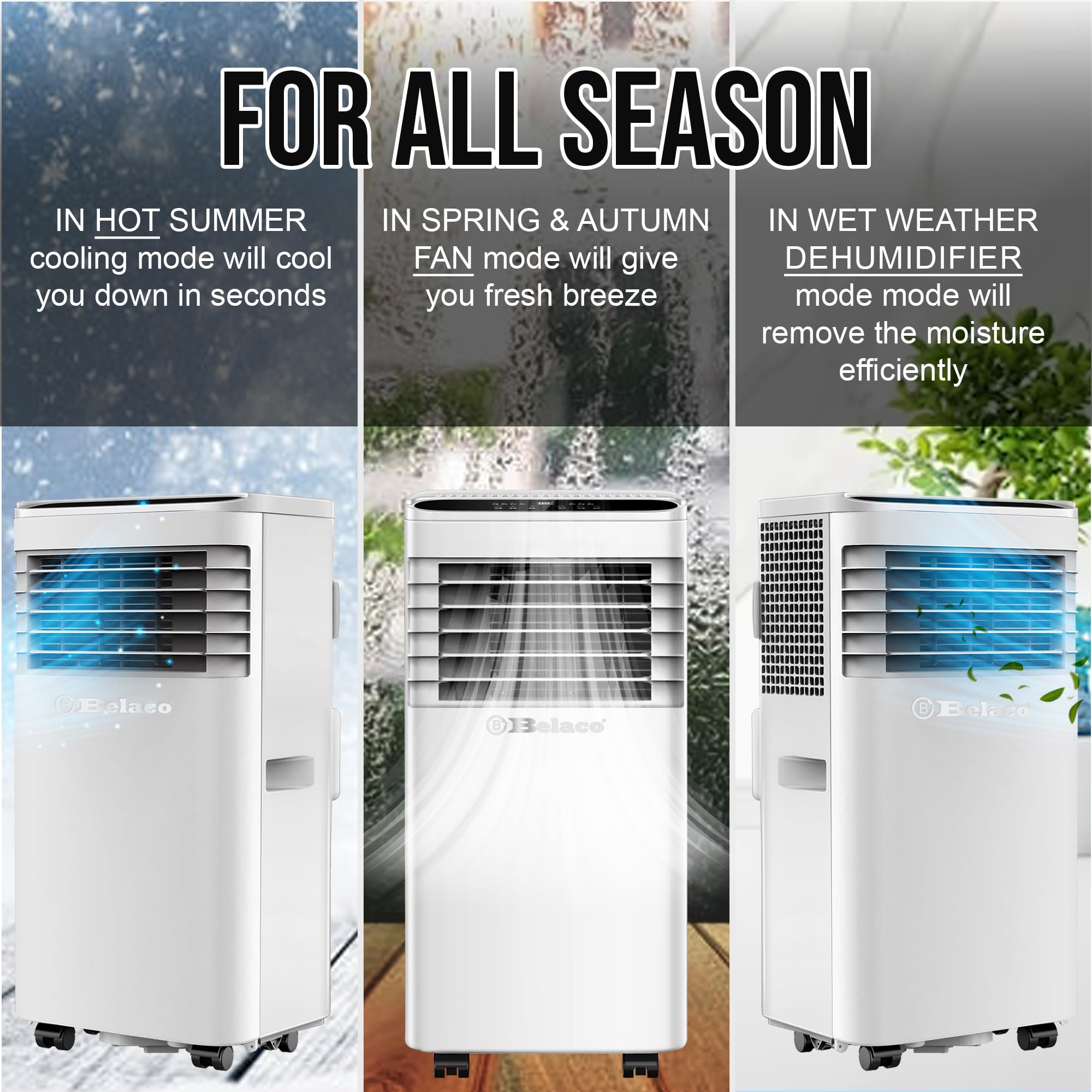 - 【POWERFUL 9000BTU COOLING】 Belaco Air Conditioner of 9,000 BTUs, delivers an immediate cooling in your Home, Bedroom, Cabin, Office, Living Room, Kitchen. The Portable Air Conditioners gives 7000BTU power on speed 1 and 9000BTU power on speed 2 which is ideal for space up to 215 square feet.