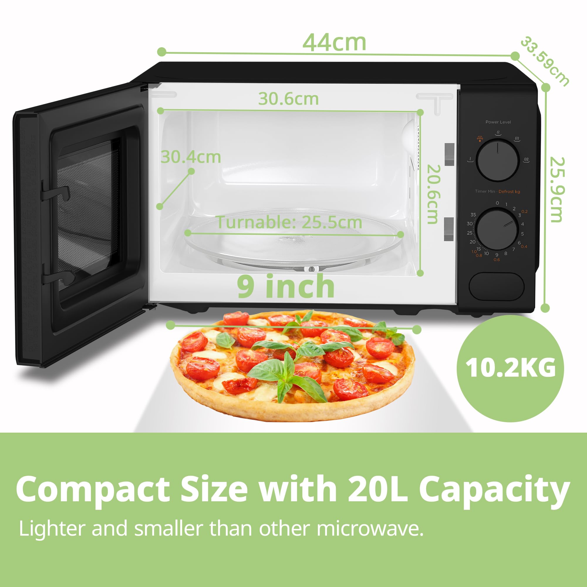 - 【Compact Size for Tight Spaces】 Specifically designed as a space-saving countertop microwave (440×335.9×259mm) with 20L smart capacity. Perfect for bedsits, studio flats, or student dorms – fits under cabinets while handling 9″ dinner plates. Internal dimensions 306×304×206mm.