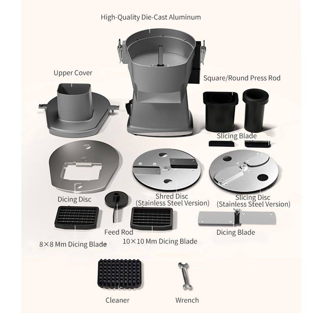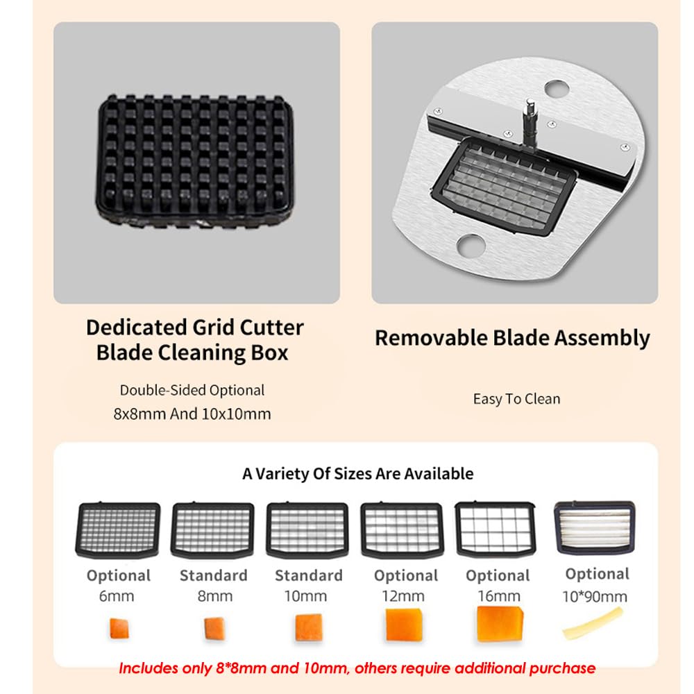 - MULTIPLE BLADE OPTIONS: Includes both 2mm and 3mm shredding blades, and mesh blades (8*8mm & 10*10mm)for different cube dicing sizes