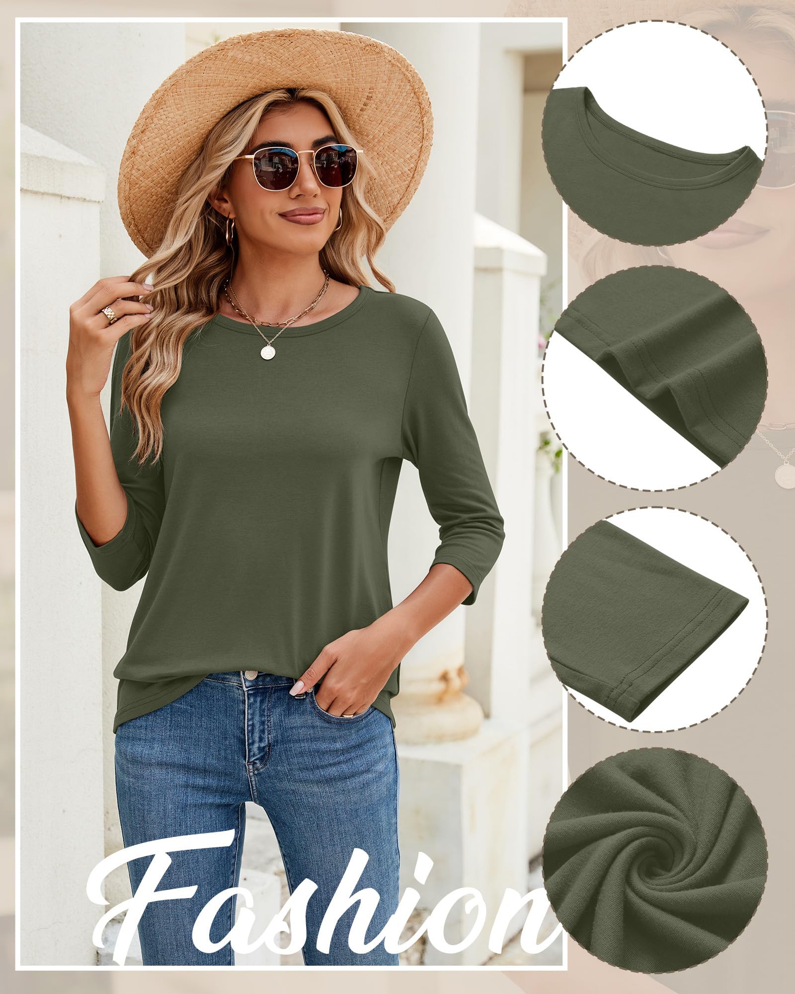 - Color Size Care: crew neck tops offer a variety of colors and sizes to choose from; The beautiful colors are suitable for women of different ages, and there are enough quantities for you to mix and match easily; Simple, solid color 3/4 sleeve tops are available in 5 sizes, S-2XL; Please check the size chart carefully before placing an order; This fitted t shirt can be machine washed or hand washed in cold water on a gentle cycle, hang to dry, and will not shrink easily after multiple washes