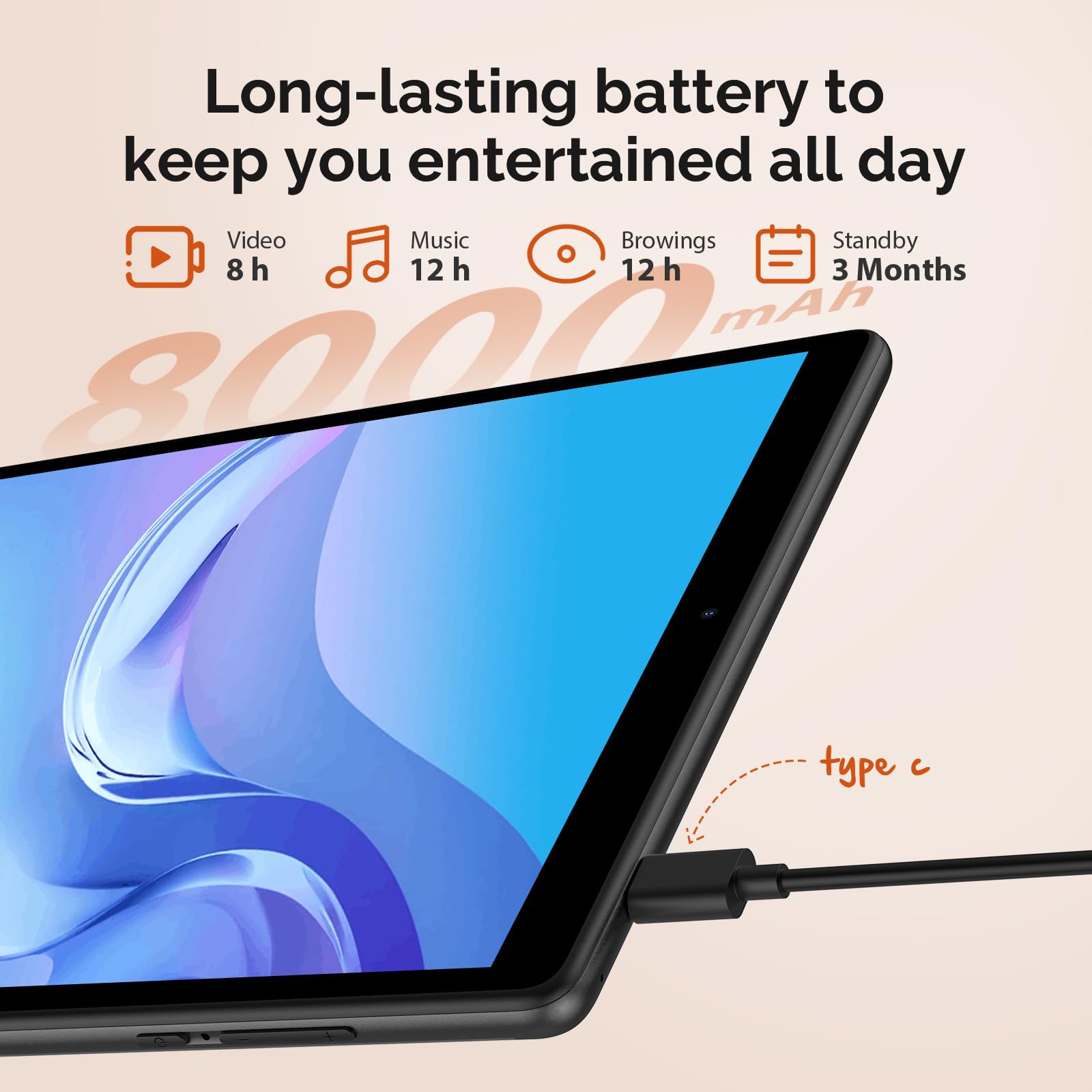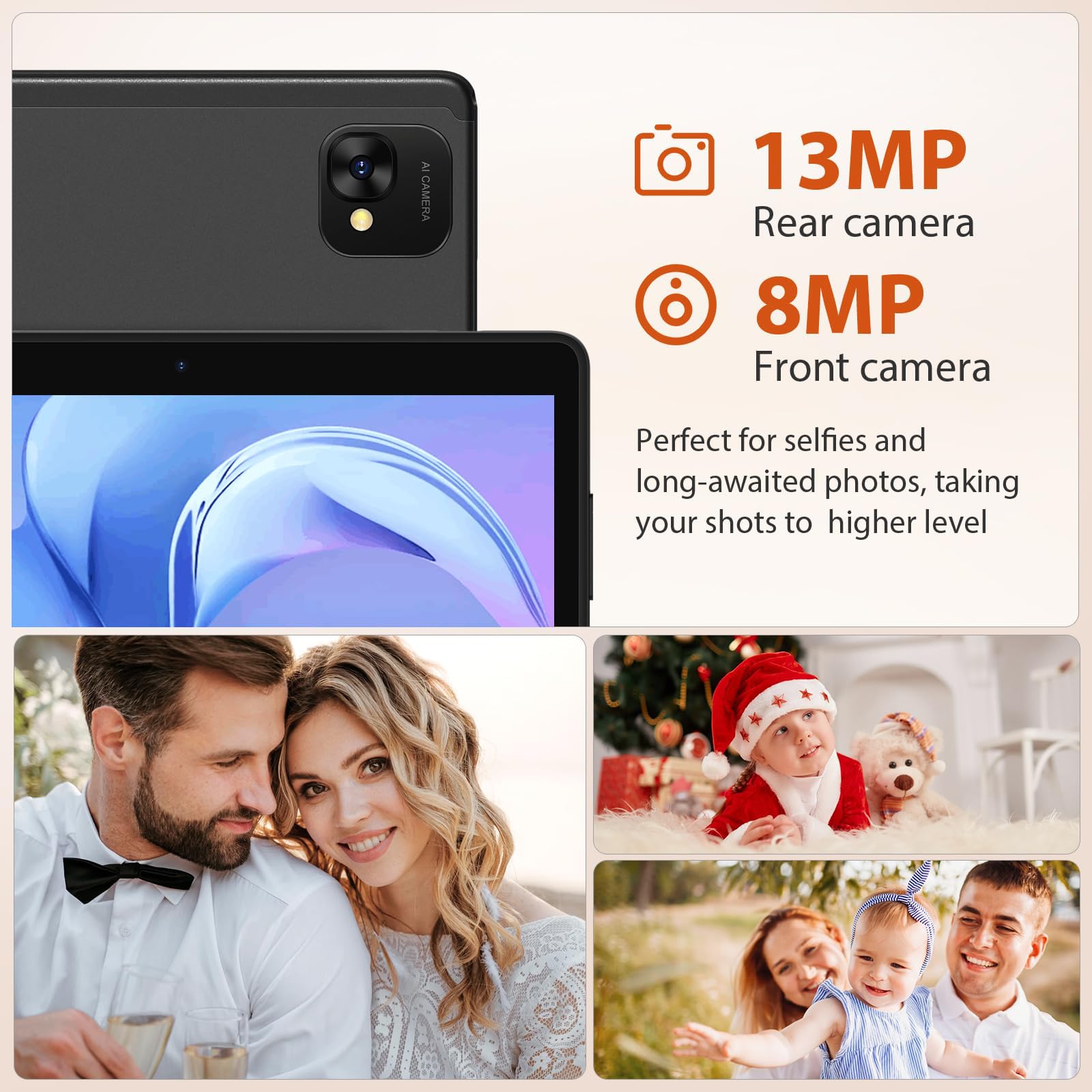 - 【13MP+8MP camera &8000 mA battery 】 Tablets feature 13MP+8MP camera and large 8000 mA battery ,You can play games, watch videos, listen to music, browse the web without worrying about power problems, you can play all day.
