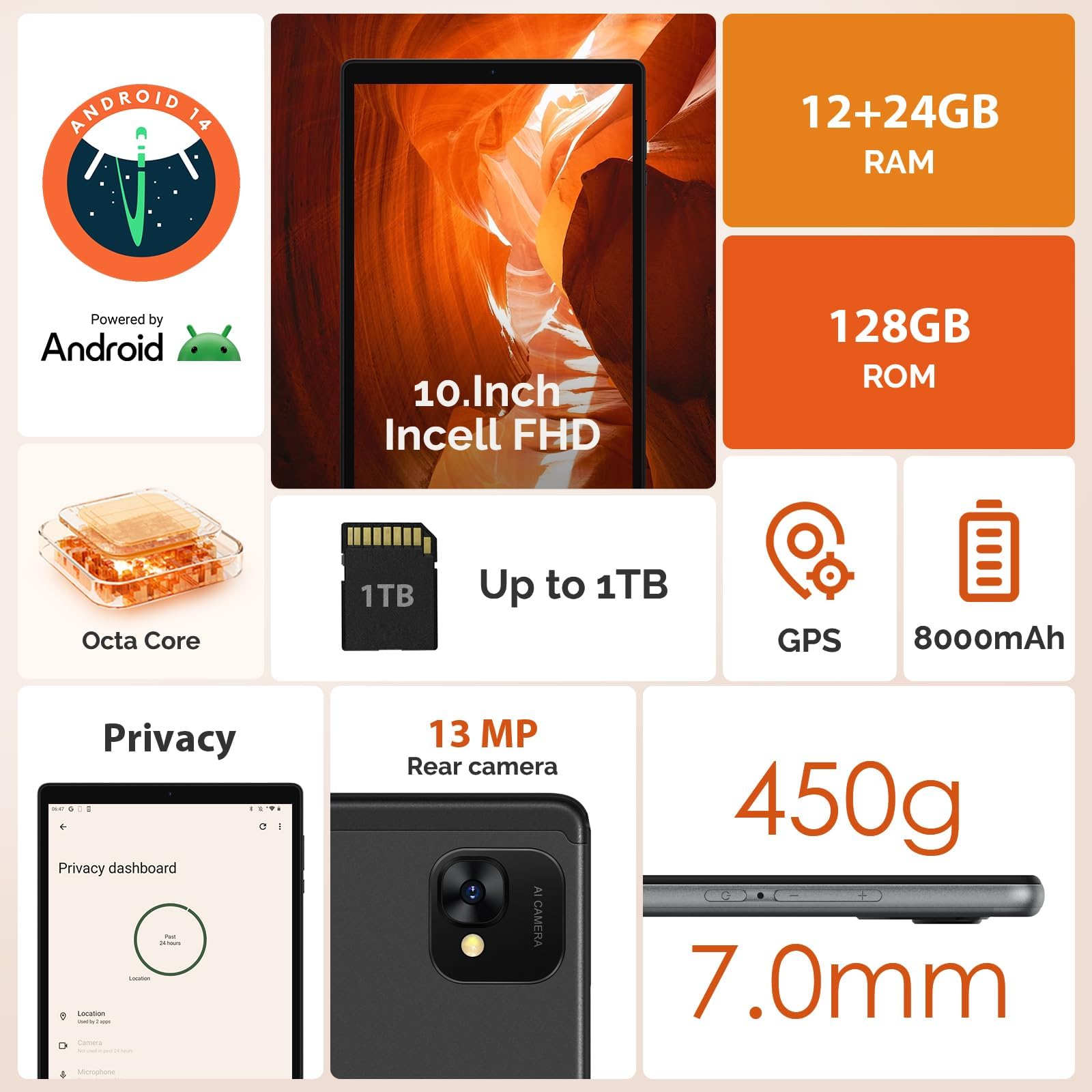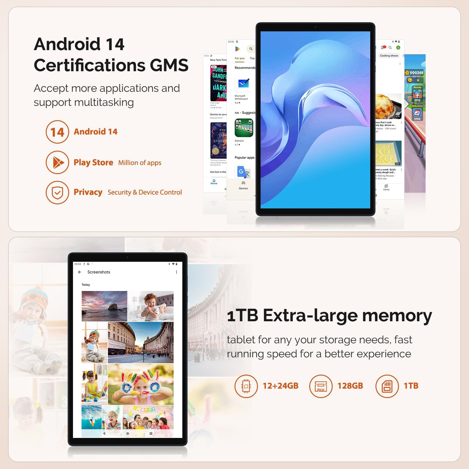 - 【Latest Android 14 System 】The Android 14 system has been upgraded and strengthened in terms of tablet user experience, including system operation experience and optimized experience for some apps. meanwhile, improves privacy and security for better protection of privacy and data control.