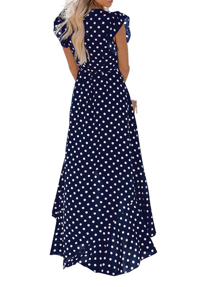 - Long floral print dress with a feminine touch and a sexy V-neckline. Tie belt at the waist makes it easy to accentuate your body line. The irregular high-low hemline is unique and wraps around to give you a unique look.