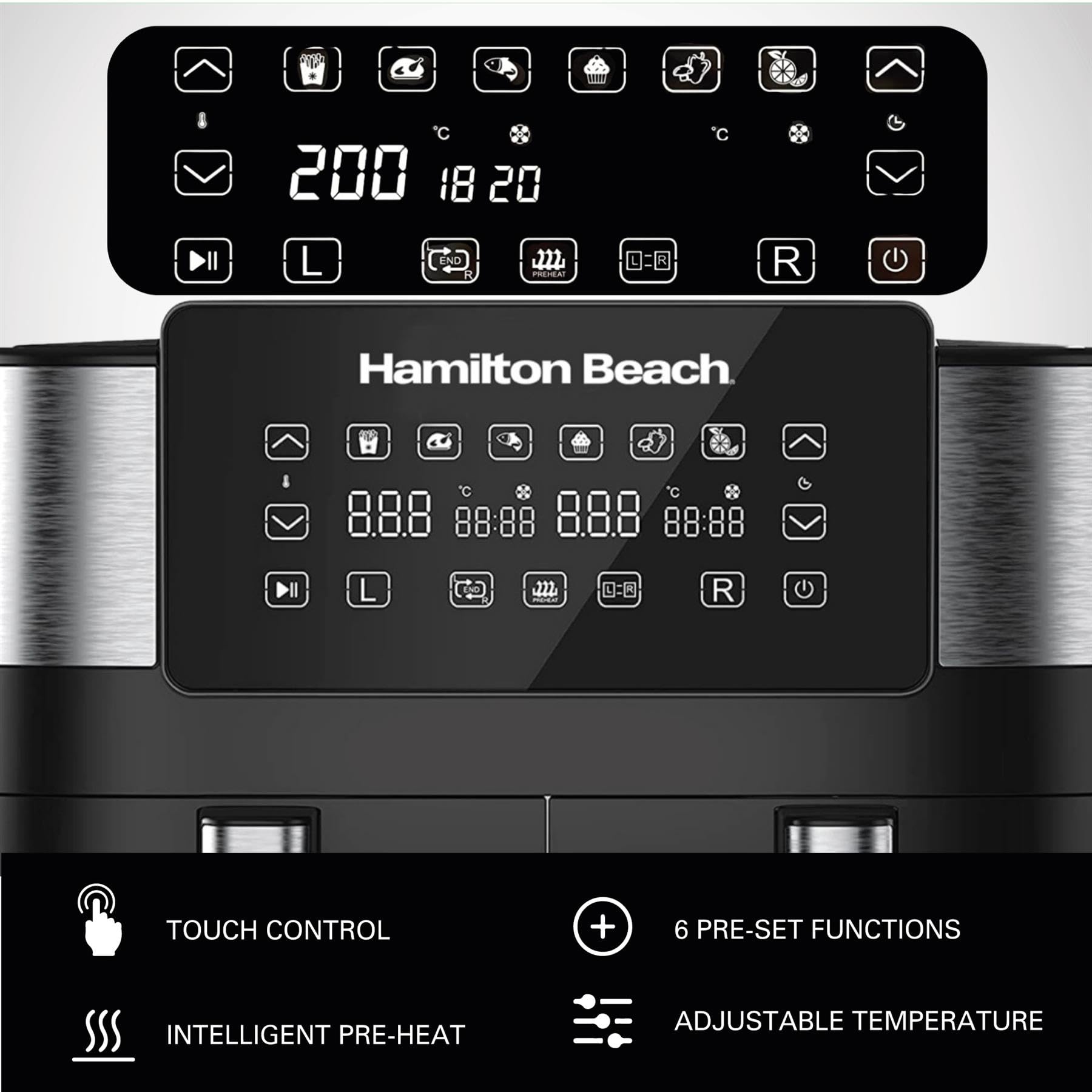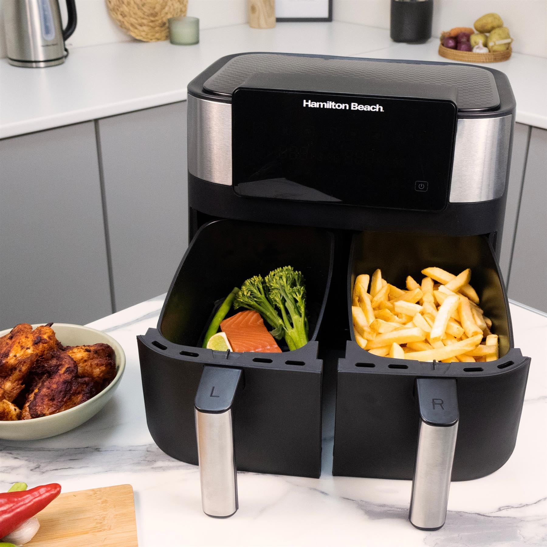 Hamilton Beach HealthyCook 8L Dual Air Fryer, 2 Drawers, 8L, 8 Portions, 6 Pre-set Programmes, SYNC function and Adjustable Temperature Settings, Black, HB4006