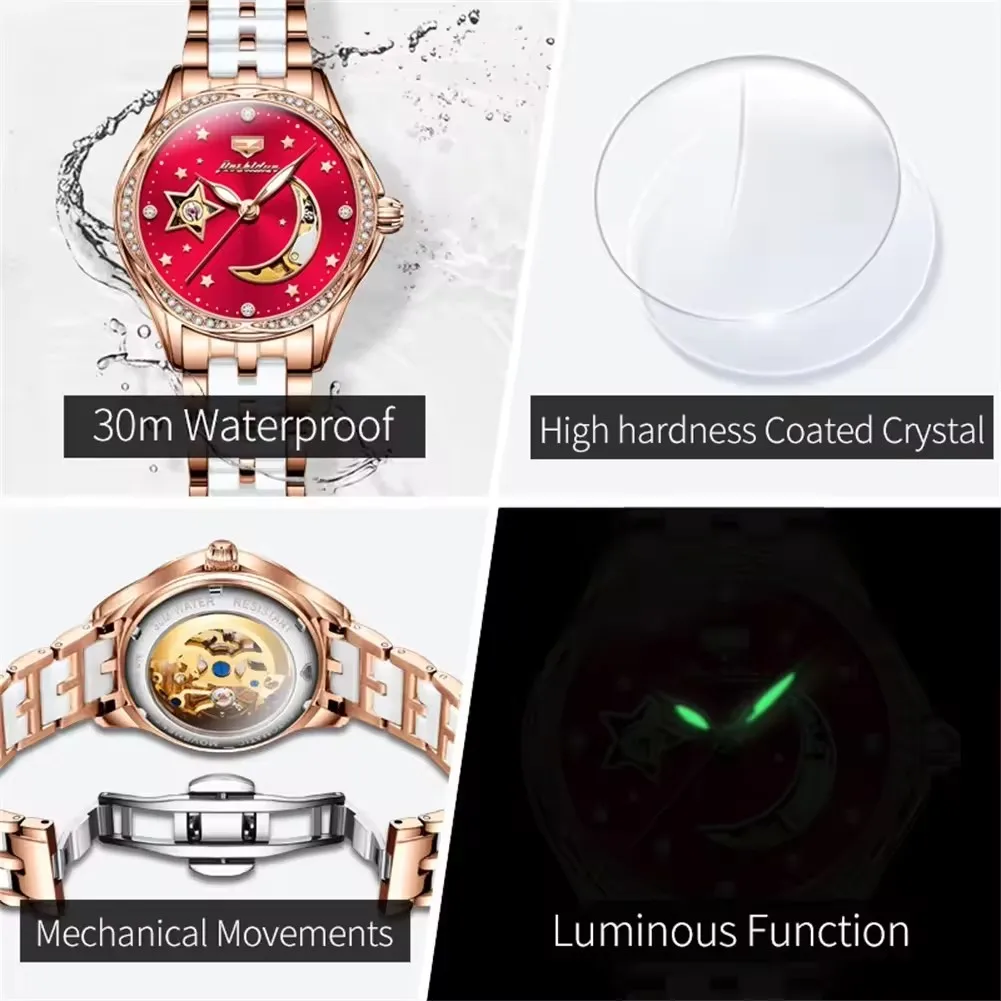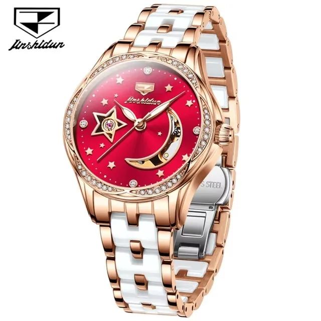 Jsdun 8962 Hollow Moon Star Diamond Dial Brand Elegant Automatic Mechanical Women’s Watch Luxury Stainless Strap Women’s Watches
