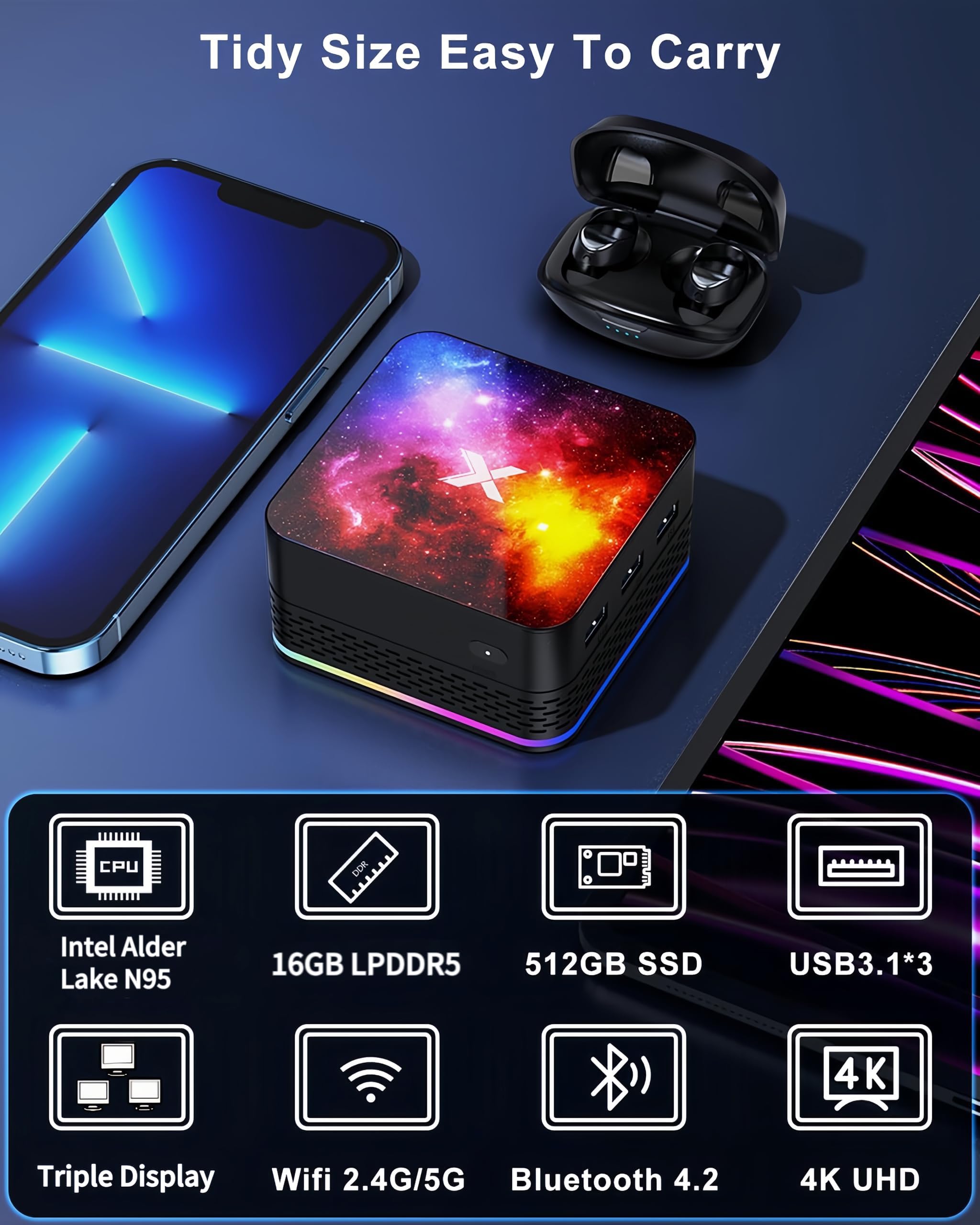 - 【16GB LPDDR5+512GB SSD】Mini PC comes with 16GB of DDR5 and a 512GB M.2 SSD with storage speeds up to 3200 MHz. with massive storage space, your Mini PC becomes an office computer that runs and downloads faster.