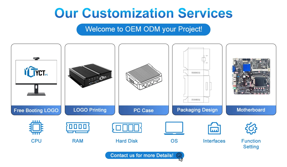 Logo Customization: Free Booting Logo, Free Sticker Logo, Laser Logo, Silk Screen Printing Logo, etc. More Customization: Customized Interfaces, ITX Motherboard Design, Mini PC Case Design, Customized Packages, etc. Kindly inquiry us for further information!