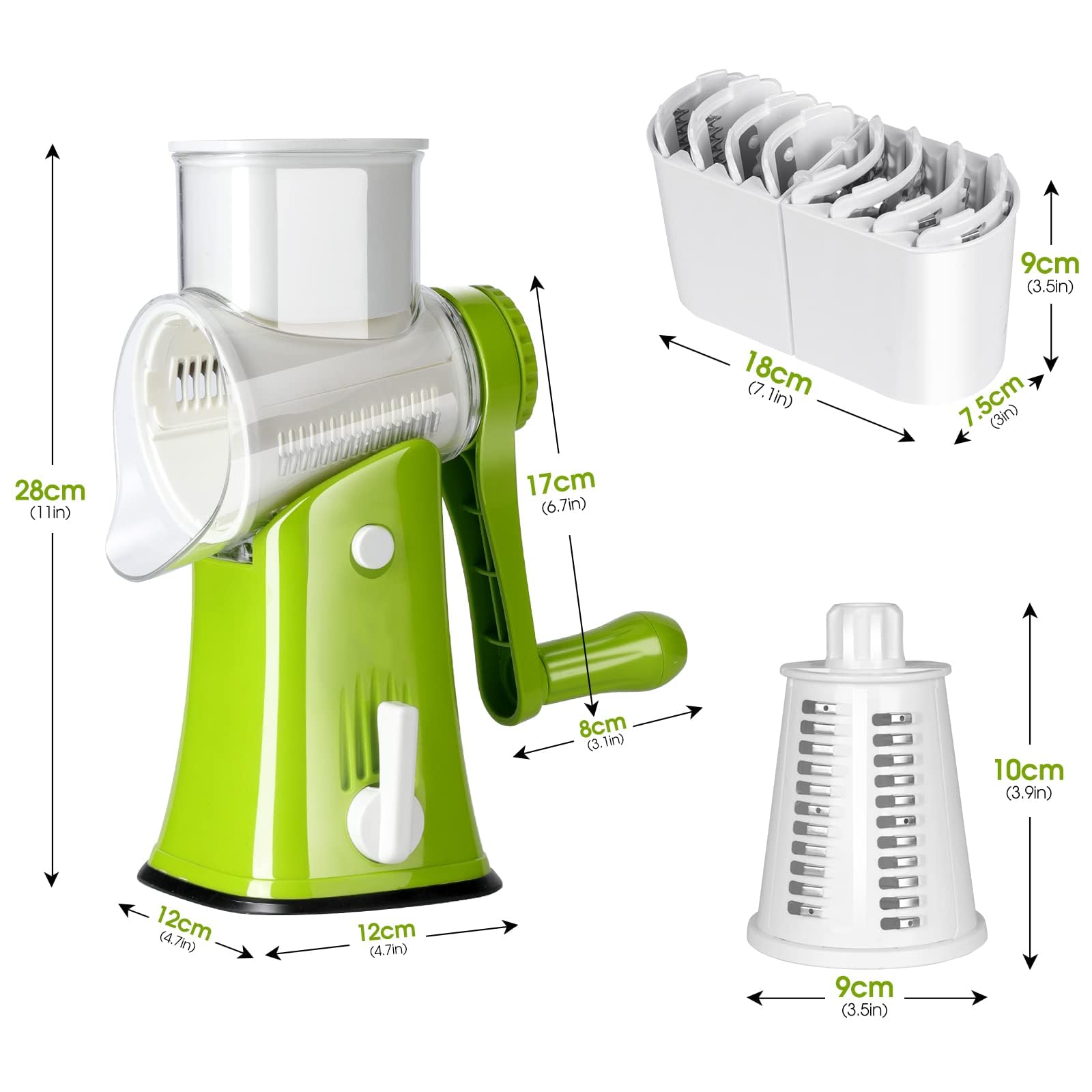 - PRACTICAL AND VERSATILE IN KITCHEN: You can install the cutting blade on the drum to deal with food according to actual needs. A manual rotary vegetable slicer can replace the peeler, grinder, and chopper. Suitable for cheese, veggies, fruits, nuts, chocolates, garlic,pizza and so on.