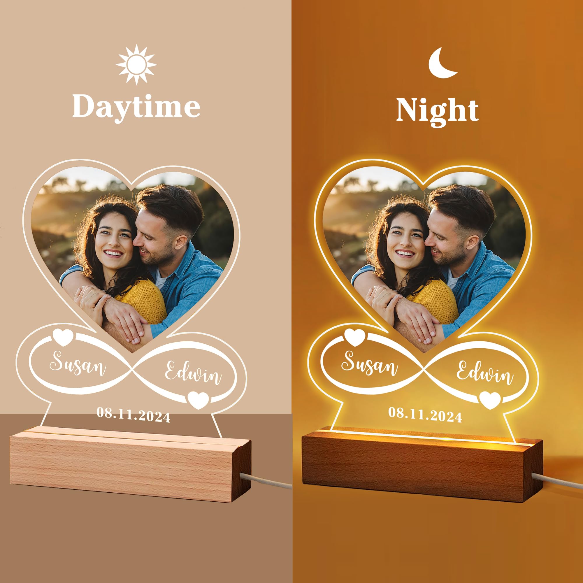 - Ideal Personalised Gifts: Acrylic photo plaque calendar night light, 7 colors change light, and your love and heart are completely passed on to him or her. It is the best gift to express love, whether it is Christmas, Anniversaries, Birthdays, Weddings, Engagements, Valentine’s Day. These are all pleasant surprises.