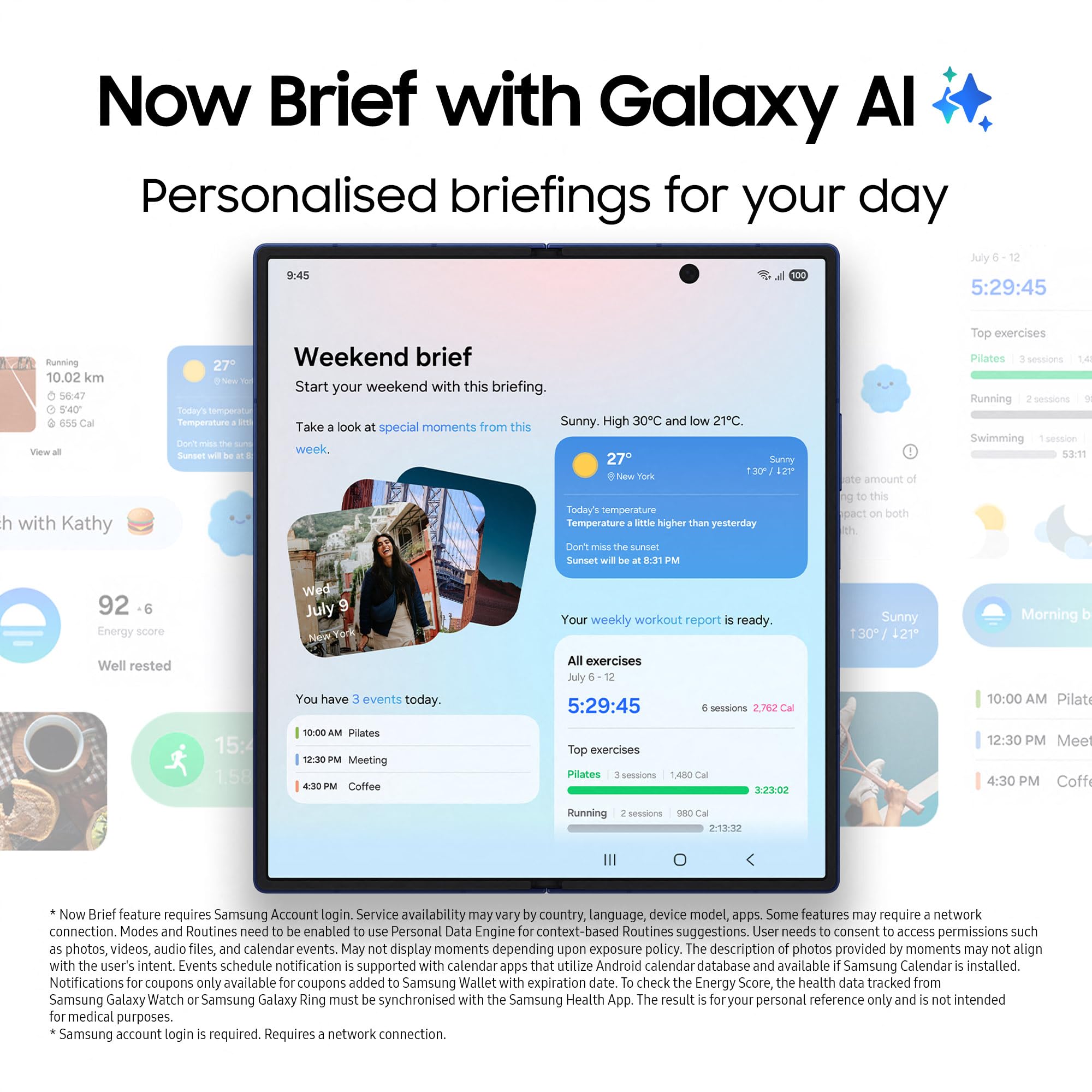 - With Galaxy AI on the Galaxy Z Fold7’s big screen, you can ask for advice and get information on your smartphone in real time, enhance and edit your photos to your heart’s content, receive personalised rundowns for your day and more⁹ ¹⁰ ¹¹ ¹² ¹³