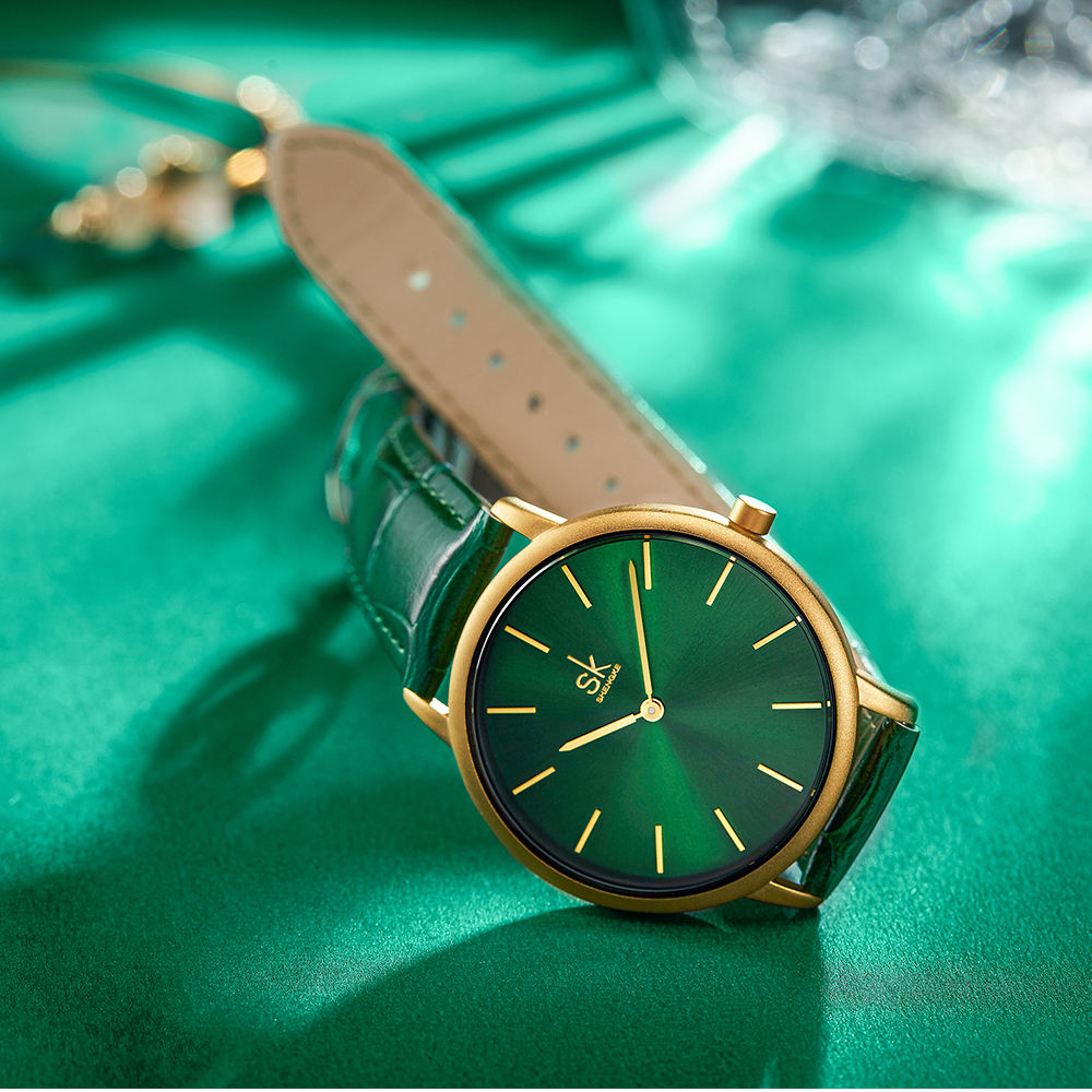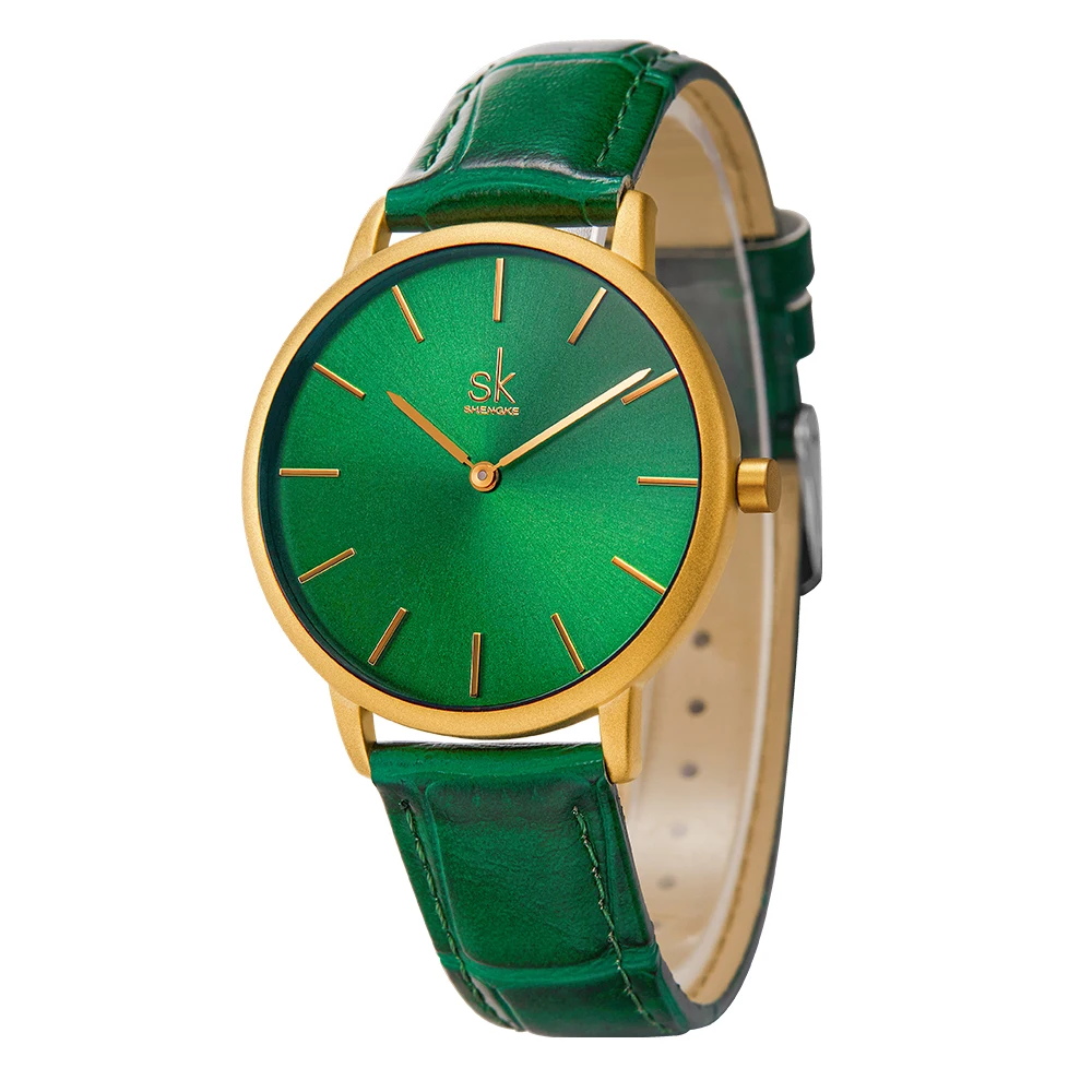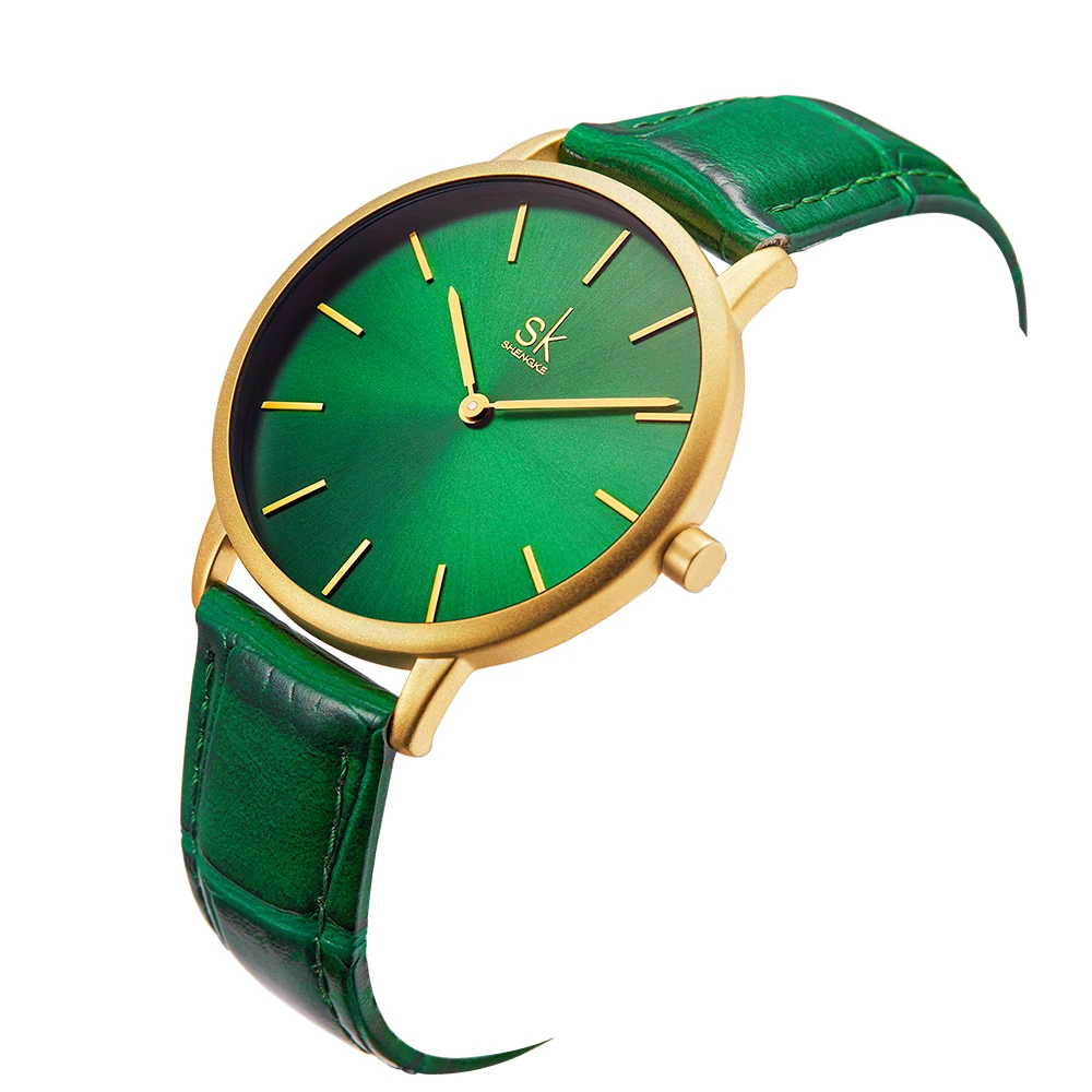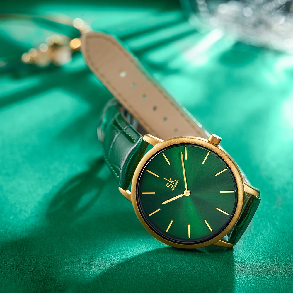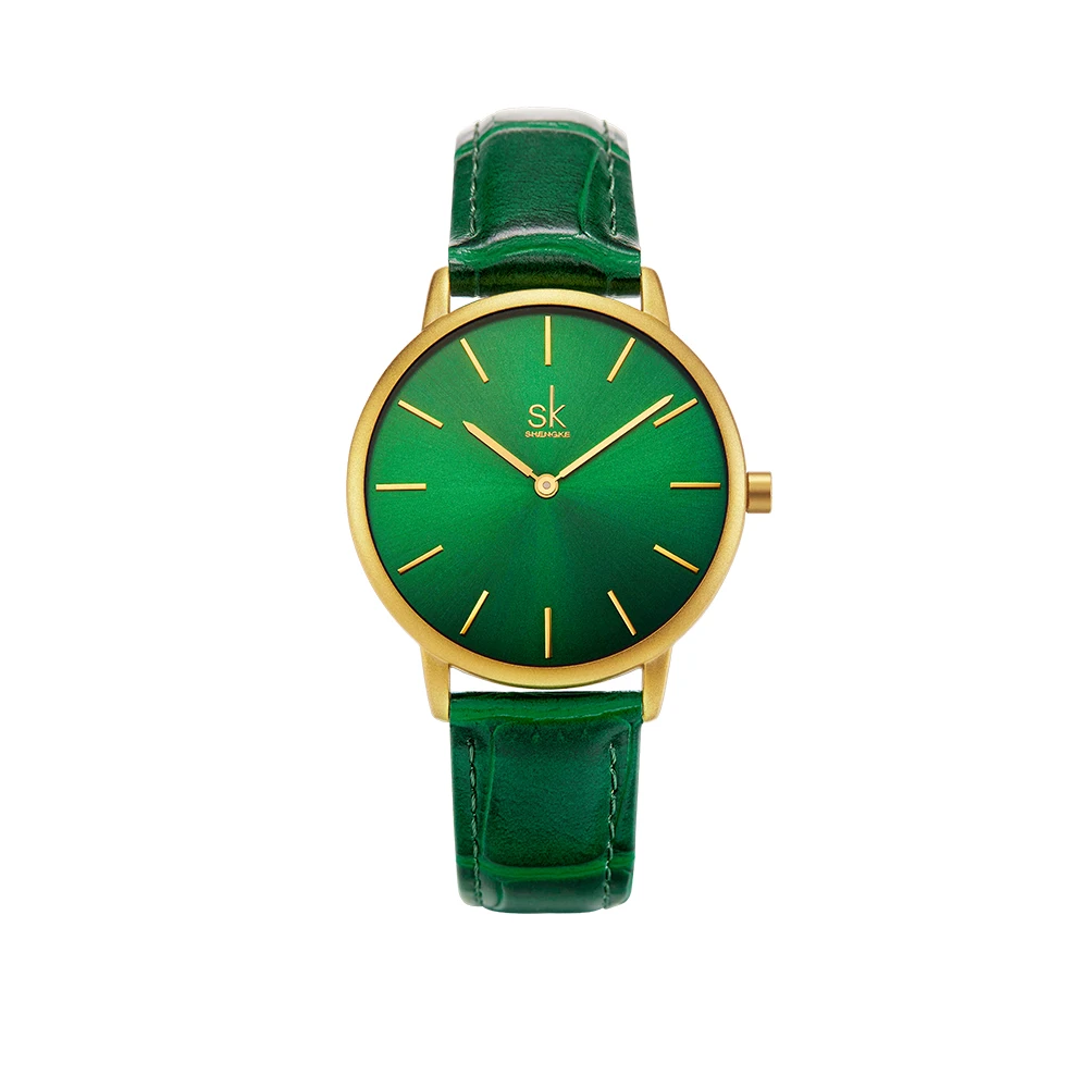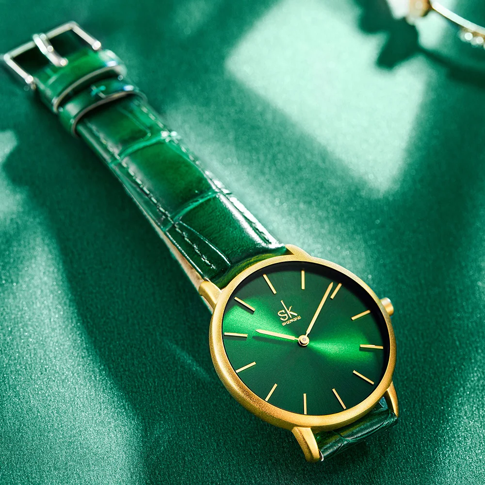 Shengke Women’s Watches Fashion Green Dial Ladies Watch Luxury Ultra Thin Female Quartz Wristwatch Green Leather Relojes K0134