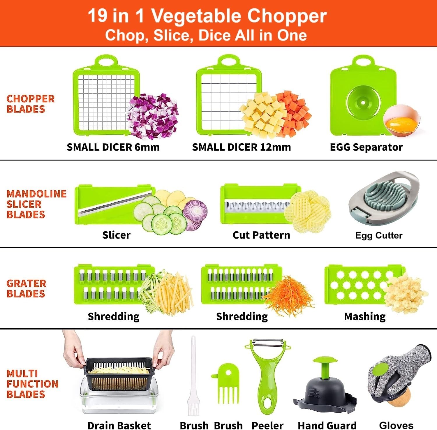 - 14 in 1 Multifunction This product contains 8 freely interchangeable blades for large or small dice, thick or thin slices, shredded or julienne. An egg separator to easily separate egg whites from yolks