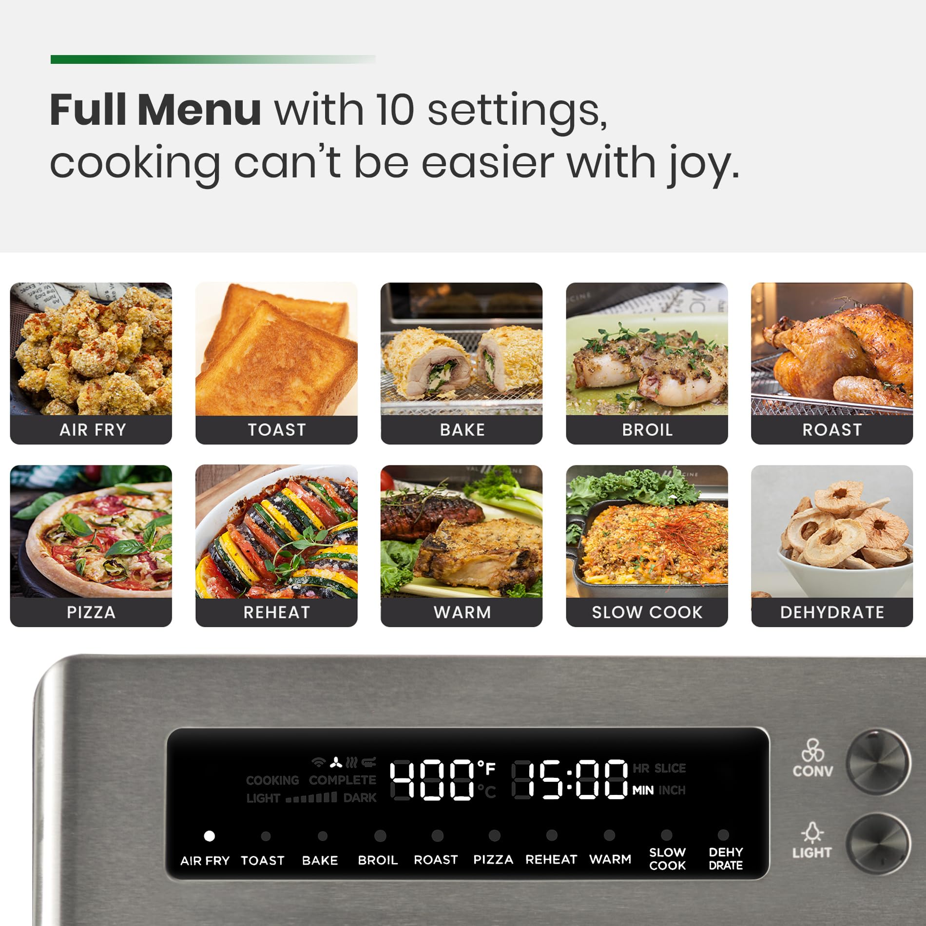 - [SUPER VERSATILE “10-in-1” AIR FRYER CONVECTION TOASTER OVEN] Unlike typical air fryer or oven with a single function, we take it up a notch by offering 10 preset digital functions that include Air Fry, Toast, Bake, Broil, Roast, Reheat, Warm, Slow Cook, and Dehydrate. This versatile 10-in-1 combination allows you to prepare a variety of dishes with ease and convenience, making your cooking experience more enjoyable than ever before.